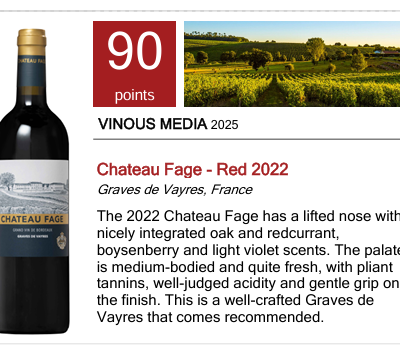 The 2022 Chateau Fage has a lifted nose with nicely integrated oak and redcurrant, boysenberry and light violet scents. The palate is medium-bodied and quite fresh, with pliant tannins, well-judged acidity and gentle grip on the finish. This is a well-crafted Graves de Vayres that comes recommended.