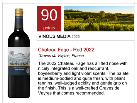 The 2022 Chateau Fage has a lifted nose with nicely integrated oak and redcurrant, boysenberry and light violet scents. The palate is medium-bodied and quite fresh, with pliant tannins, well-judged acidity and gentle grip on the finish. This is a well-crafted Graves de Vayres that comes recommended.
