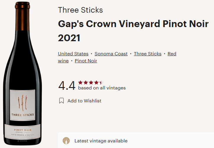 Three Sticks 2021 Pinot Noir Gap’s Crown Vineyard